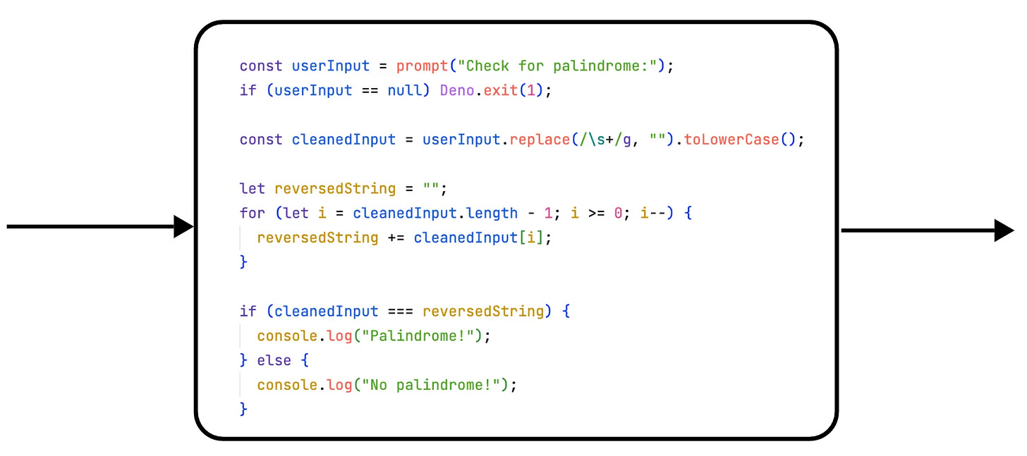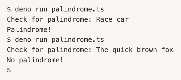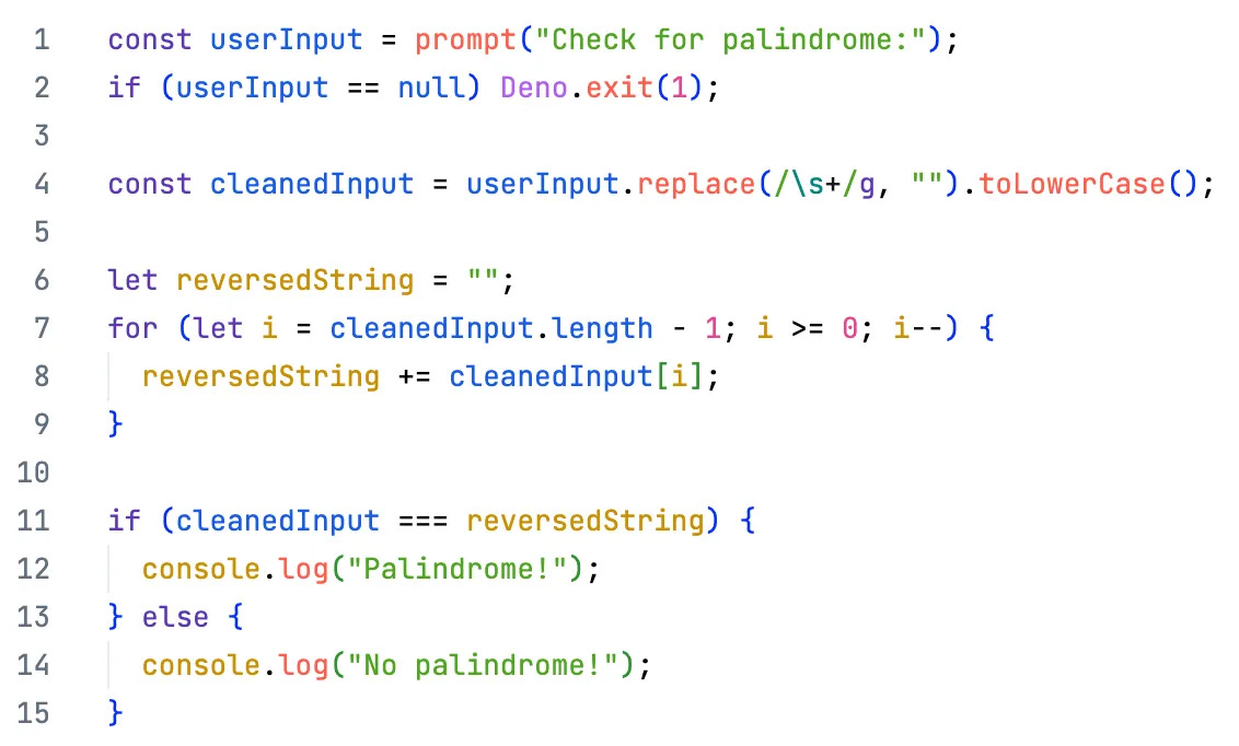 Then a reversed version of the input is produced. The loop starts at the end of the string and runs to its beginning. Each character is appended to a new string which thus contains the characters in reverse order. Ok, that's straightforward. But, hm... isn't there a simpler way?