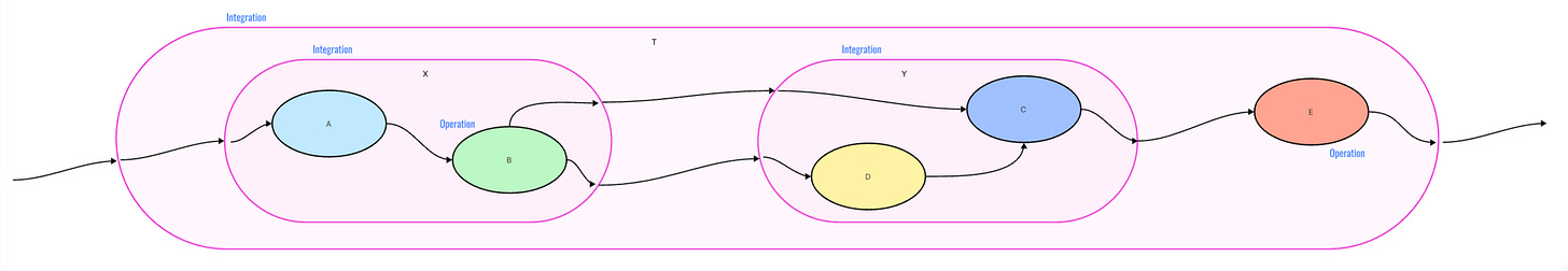 This means that the integration of objects behaves as a black box just like the individual objects it integrates. Integrations and their operations are in a whole-part relationship. Yet, it's evident that integrations are also parts of an even larger whole. Integrations can be integrated along with operations and other integrations. It’s a hierarchy of integrations with objects at the bottom.